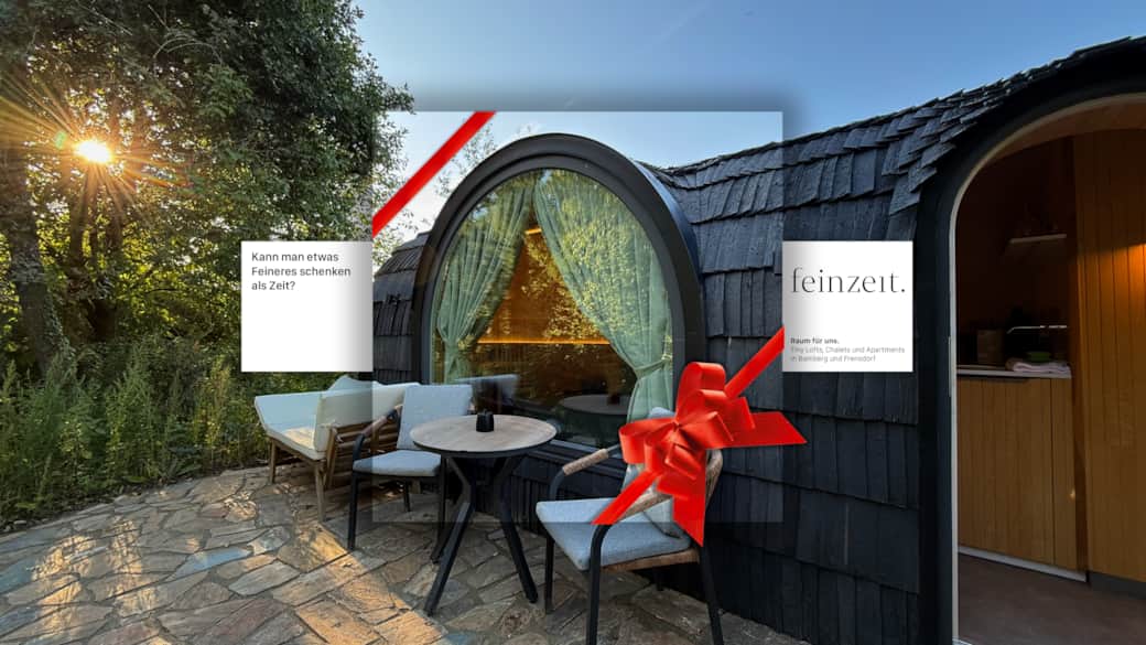 Mit einem feinzeit-Gutschein schenkst Du keine Dinge, sondern Raum: Raum für Erholung, für Zweisamkeit, für Ankommen. Ob im Chalet mit privater Sauna, im Loft mit Blick ins Grüne oder in einem unserer Apartments mitten in Bamberg – es ist immer eine Einladung zum Langsamerwerden.