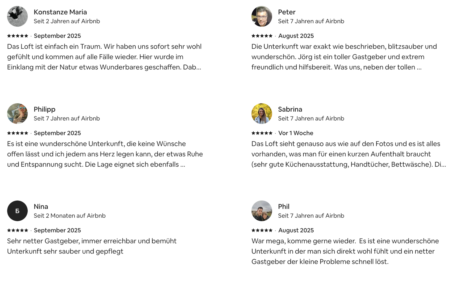 Wir können viel über unsere Chalets, Lofts und Apartments erzählen – aber was zählt wirklich? Dass unsere Gäste sich bei uns wohl fühlen. Unser Team gibt jeden Tag alles, um eines zu ermöglichen: Eine feine Zeit! Das belegen die vielen positiven Bewertungen und Rückmeldungen, die wir persönlich, aber auch über Buchungsportale wie booking.com oder AirBnB erhalten!